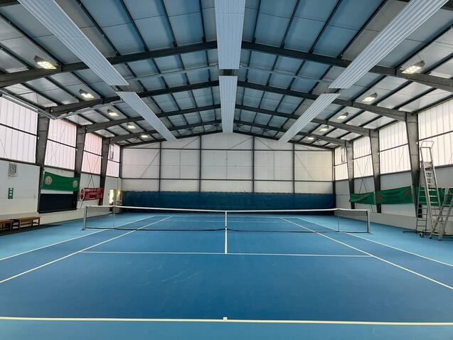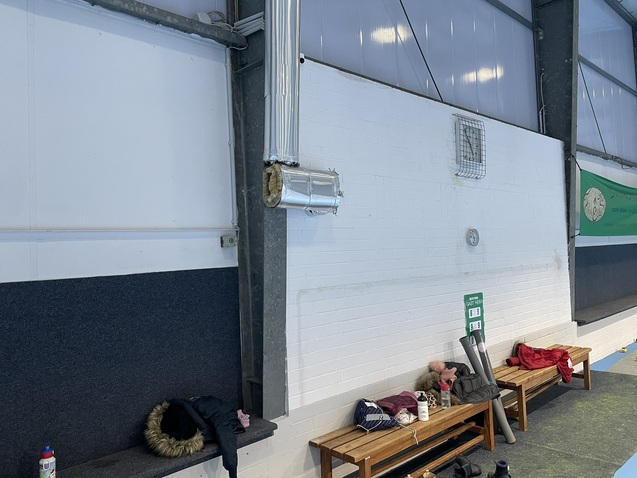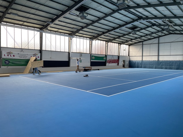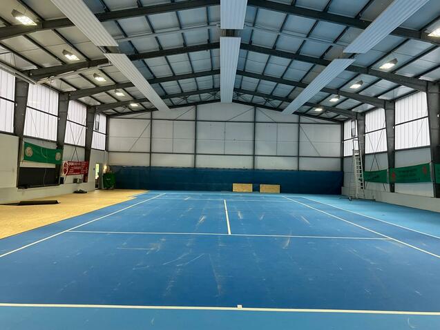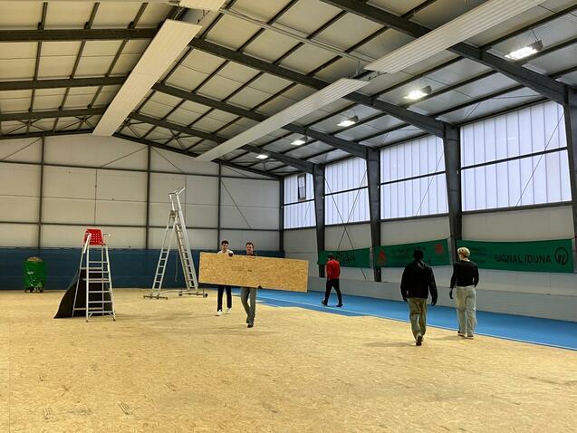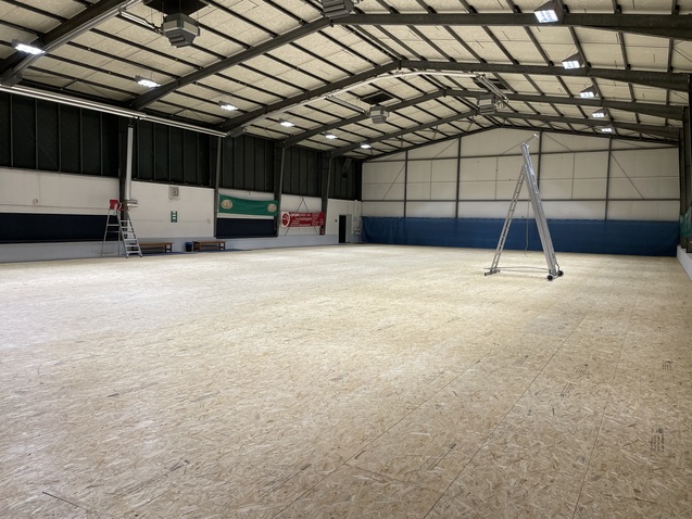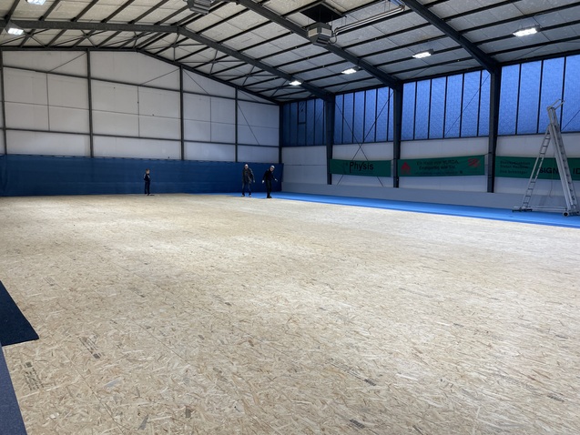 die Halle bitte nur im Bereich des Teppichs mit Straßenschuhen betreten.